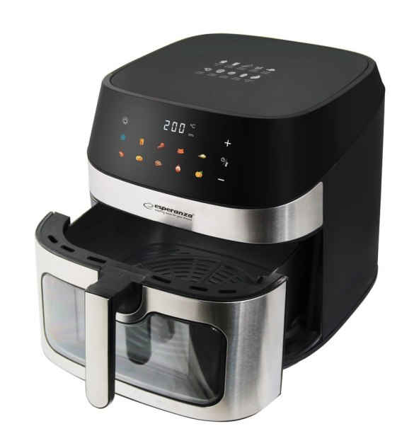 Frytkownica beztłuszczowa Esperanza PATATE AL FORNO to doskonałe rozwiązanie dla tych, którzy chcą cieszyć się smakiem ulubionych potraw w zdrowszej wersji. Dzięki technologii cyrkulacji gorącego powietrza przygotujesz chrupiące frytki, soczyste mięsa, aromatyczne warzywa, a nawet pieczone owoce bez dodatku tłuszczu i bez kompromisów w smaku. Duża pojemność 8 litrów sprawia, że urządzenie idealnie sprawdza się przy przygotowywaniu posiłków dla całej rodziny. Intuicyjny panel sterowania z kolorowymi ikonami i aż 10 gotowymi programami (w tym menu owocowe i rozmrażanie) zapewnia wygodną obsługę oraz precyzyjne dopasowanie parametrów pieczenia. Dzięki dużemu oknu podglądu z łatwością kontrolujesz postęp przygotowania potraw. Regulacja temperatury oraz timer o dwóch zakresach umożliwiają pieczenie zarówno krótkie, jak i długie. Antypoślizgowe nóżki zapewniają stabilność pracy, a nowoczesny design świetnie komponuje się z każdą kuchnią.