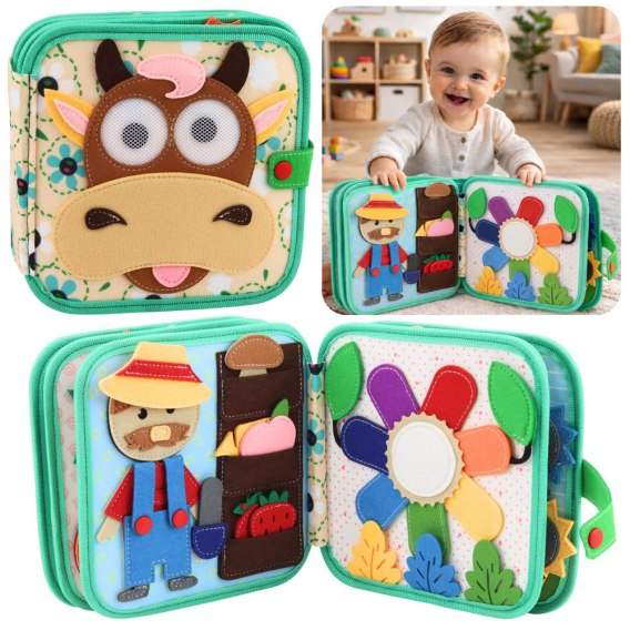 Książeczka sensoryczna filcowa z motywem krowy i zwierząt domowych to edukacyjna zabawka dla najmłodszych dzieci, która wspiera rozwój wyobraźni, zdolności manualnych oraz poznawanie świata poprzez zabawę. Kolorowa książeczka przedstawia scenki związane z życiem na wsi, dzięki czemu dziecko może poznawać zwierzęta domowe oraz elementy przyrody w ciekawy i angażujący sposób.