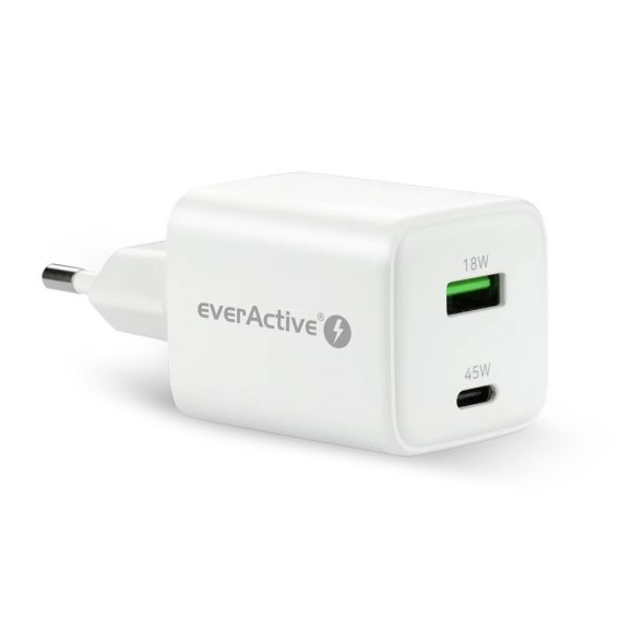 Ładowarka sieciowa GaN 1X USB, 1X USB-C 45W QC4+ PD Biała EverActive