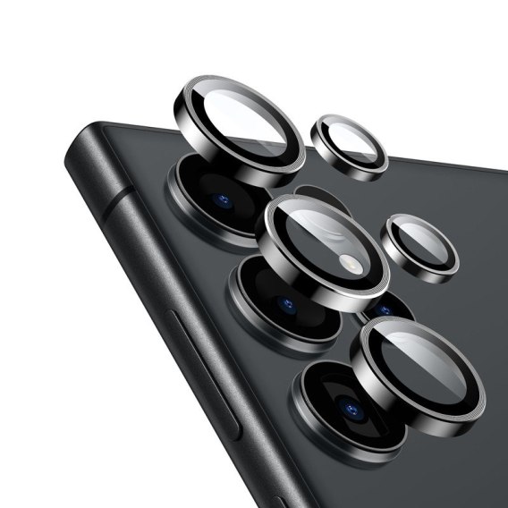 Lens Ring do Samsunga Galaxy S24 Ultra to komplet wysokiej jakości szkieł ochronnych na wszystkie pięć obiektywów kamery znajdującej się z tyłu telefonu. Wykonane one zostały ze szkła hartowanego o grubości 0.33mm oraz aluminiowych pierścieni CNC, które zapewniają dodatkową ochronę podczas upadku kamerą do dołu.