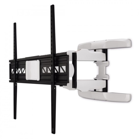 Panel i ramiona podporowe w kolorze białym zlewają się ze ścianą, zapewniając harmonijną aranżację. Natomiast czarna płytka mocująca odpowiada kolorowi telewizora. Takie rozwiązanie pasuje do wystroju wnętrza.