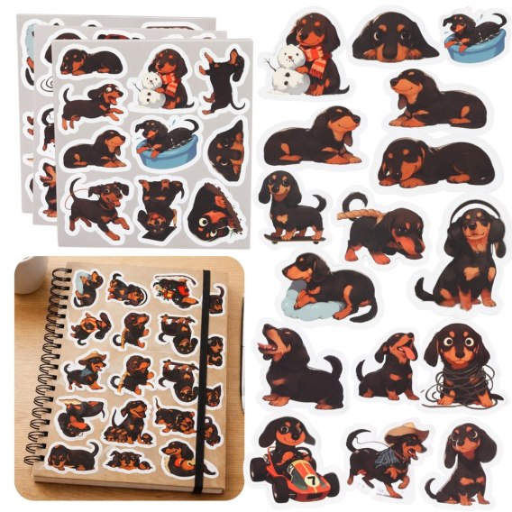Zestaw naklejek z jamnikami to urocza propozycja dla dzieci i dorosłych, którzy lubią kreatywne dekorowanie oraz zwierzęce motywy. Każda naklejka przedstawia jamnika w innej odsłonie, co sprawia, że zestaw jest różnorodny i bardzo atrakcyjny wizualnie. Naklejki doskonale nadają się do ozdabiania zeszytów, notesów, planerów, albumów oraz innych przedmiotów codziennego użytku.