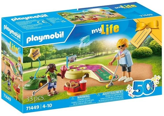 Wielogodzinną zabawę dla fanów minigolfa zapewni wspaniały zestaw upominkowy PLAYMOBIL. Spakowany w ozdobnym opakowaniu, które można spersonalizować wpisując imię dziecka, oszczędza papier do pakowania. Pole do minigolfa jest w pełni wyposażnoe do rozpoczęcia gry. Jego przednia część pozwala na idealne umieszczenie piłki do uderzenia, którą należy umieścić w jednym z trzech dołków. Pod torem znajduje się tunel, a zielone wzniesienie pełni rolę dodatkowego celu. Słodkie wafle w kształcie serca można przechowywać w dwuczęściowym pojemniku, a kije golfowe, papierowy samolot, wafelek do lodów, kubek na napoje i sznurek balonu mają praktyczne uchwyty, dzięki którym mogą być trzymane przez figurki.